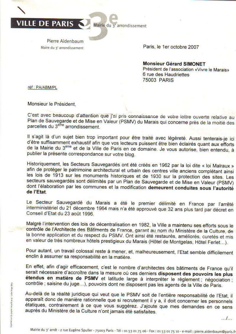 Le seul point qui retient notre intérêt concerne les enseignes et devantures. On sait à quel point les règles du PSMV (plan de sauvegarde et de mise en valeur ) du Marais sont malmenées dans un environnement où règne l’anarchie. L’A.C.E.A. se propose de remettre à ses adhérents une notice qui les guide dans leur démarche de création ou de rénovation de devantures en leur précisant qu’une demande d’autorisation de travaux est nécessaire auprès de la Direction de l’Urbanisme de la Ville. Nous avions offert au Maire de disposer gratuitement du document que nous avons édité il y a plus d’un an à ce propos, sous le contrôle des Bâtiments de France et de la Direction de l’Urbanisme de Paris