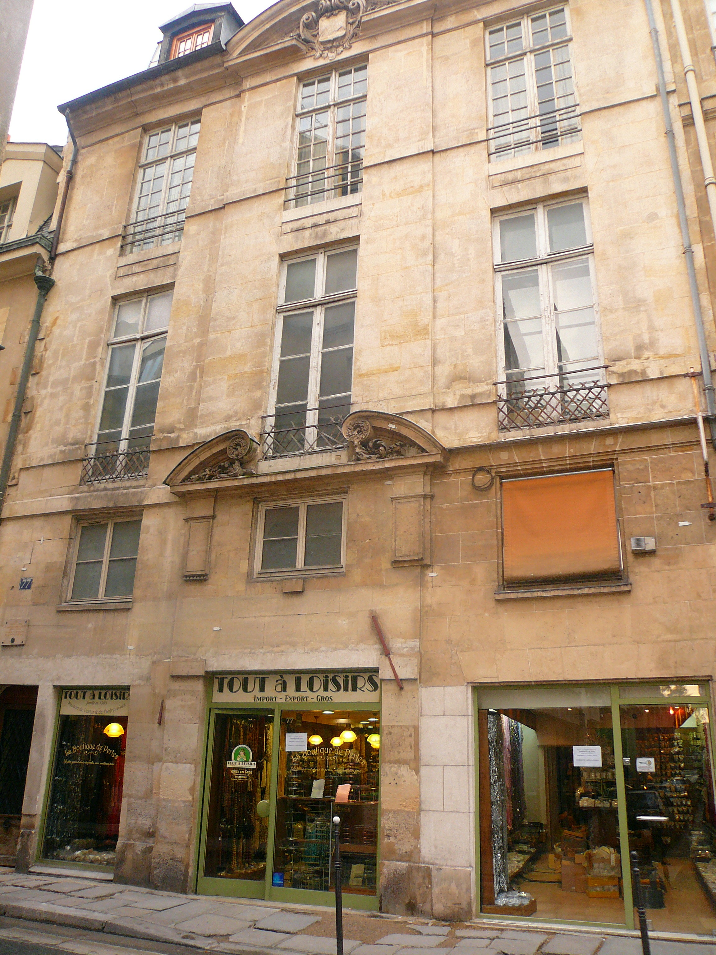 Ce fronton surmontait à l'origine une porte cochère qui est devenue la devanture d'un commerce de babioles. C'est un moindre mal : les ouvertures respectent à peu près l'architecture et on ne déplore ici ni caissons de volet roulants ni enseignes racoleuses.