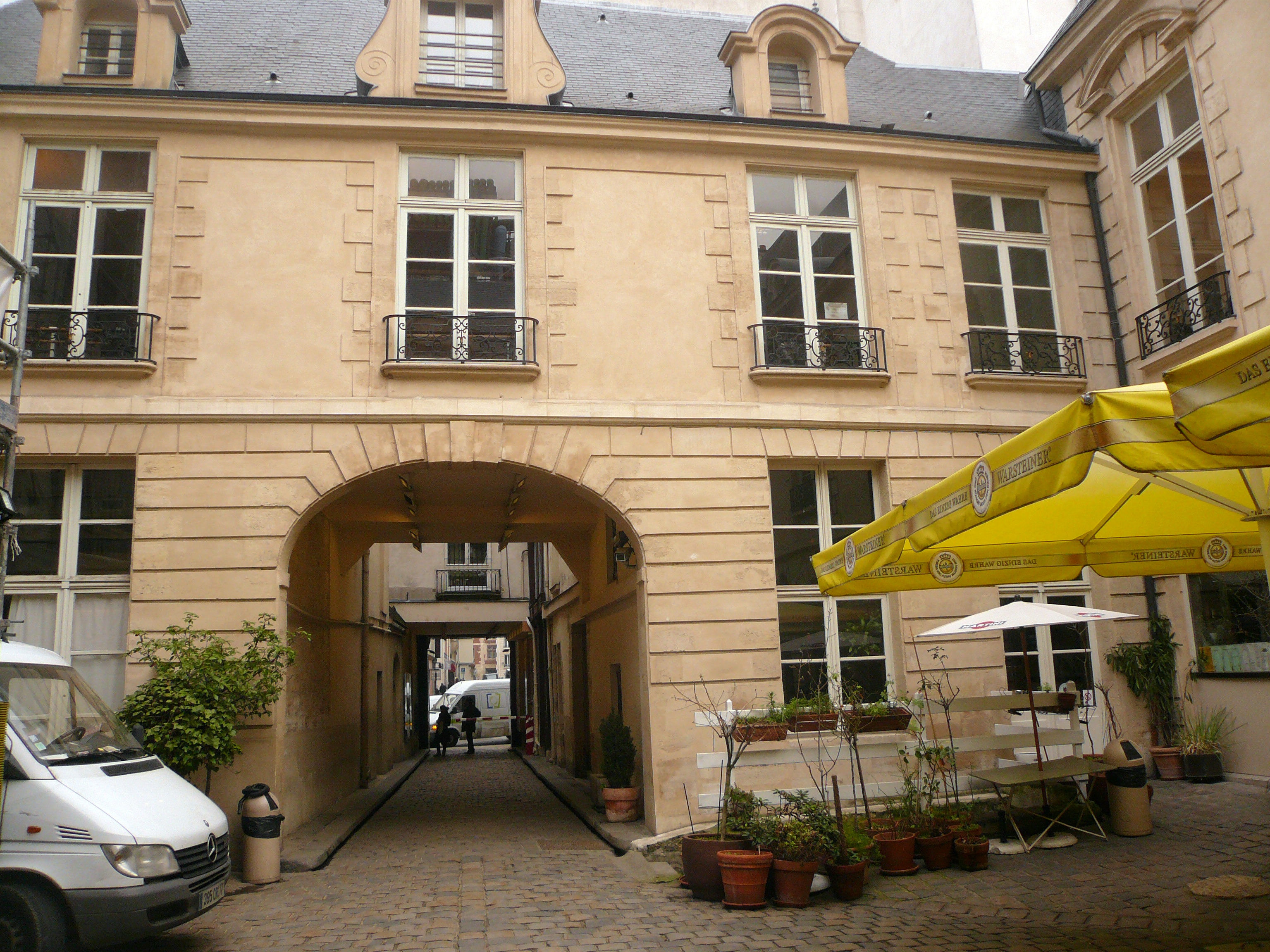 Hôtel de Berlize, cour intérieure avec au fond "le Café de la Gare". "Fenêtres encadrées de chaines harpées et munies de garde-corps, couronnées de frontons semi-circulaires à base interrompue par une clé et quatre claveaux. Mansardes accostées d'ailerons. Plafonds à poutres et solives peintes Louis XIII" (Le Marais, Danielle Chaddych - Parigramme)