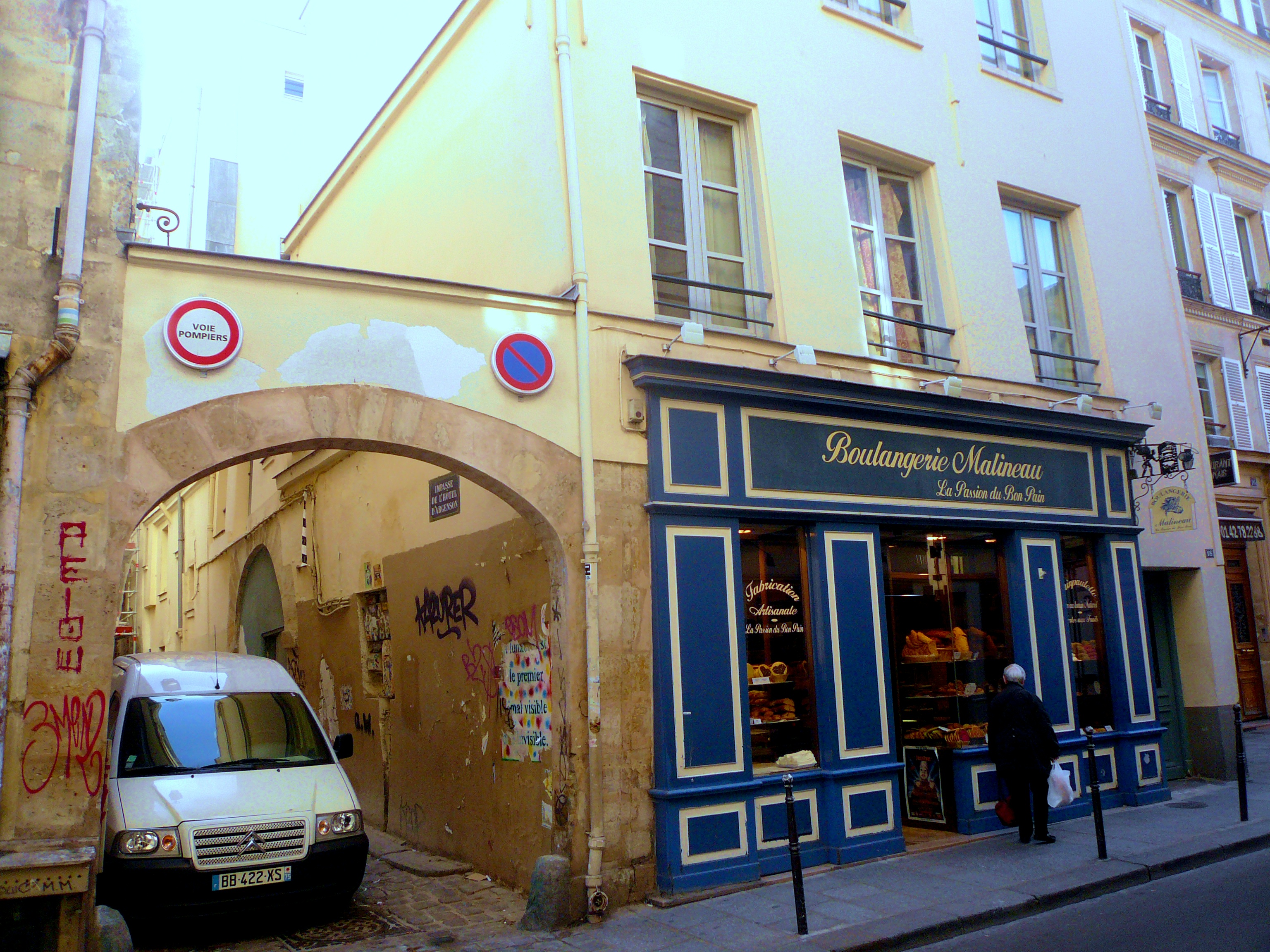 Impasse de l'hôtel d'Argenson et boulangerie Malineau, qui affiche le slogan "La passion du bon pain", 18 rue Vieille du Temple (IVe)