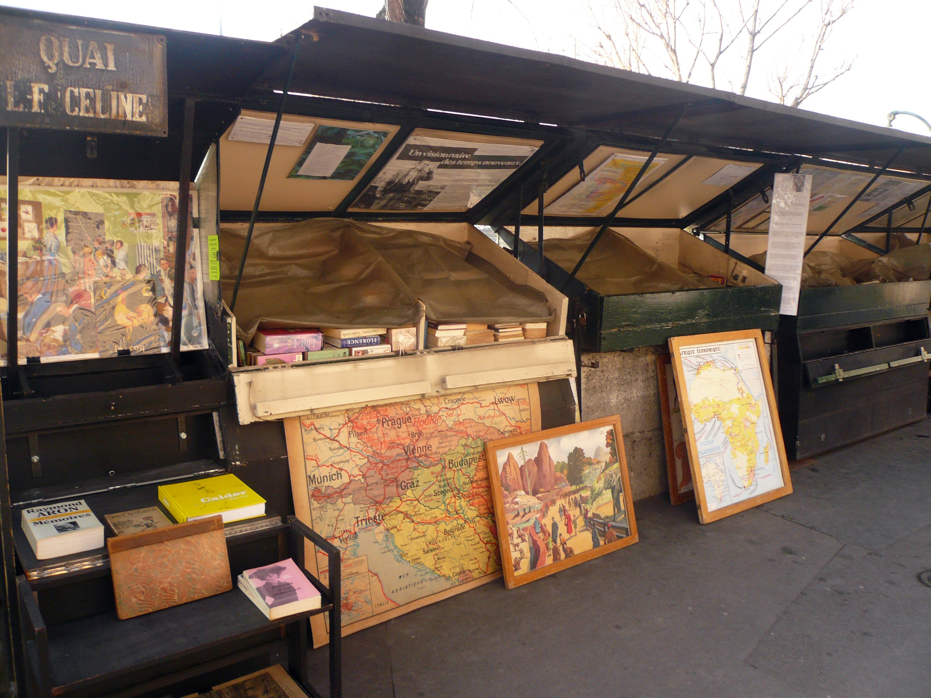 L'étalage de Ferdinand, quai dit "Louis-Ferdinand Céline", 10 mètres de linéaire et 6 coffres, grand spécialiste de cartes murales anciennes