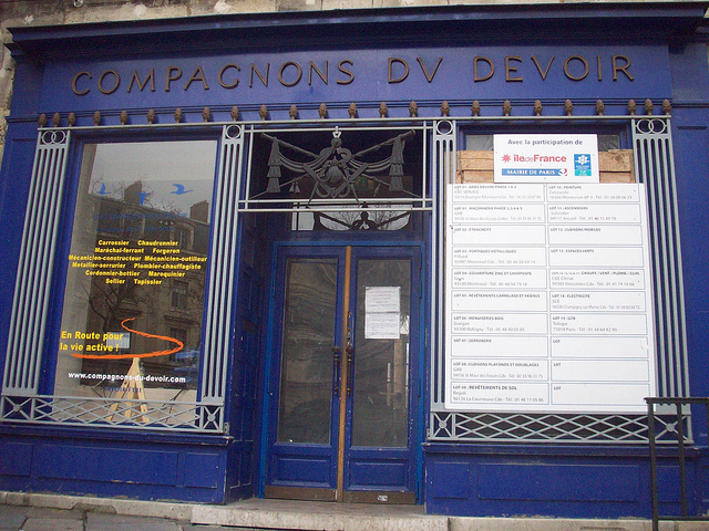 Les Compagnons d’une façon ou d’une autre sont donc très présents dans notre quartier. Sait-on que le vocable « compagnonnage » n’est usité que depuis le XVIIIe siècle et correspondait à la période d’expérimentation professionnelle qui devait être faite par le compagnon chez un maître ? Divers mythes et légendes règnent sur l’origine du campagnonnage. Celle-ci est sans doute très ancienne et remonte à l’Antiquité où des organisations de métiers se transmettaient vraisemblablement des connaissances par voie orale. Il est un fait qu’il était important au Moyen Age lorsque furent construites les cathédrales, les compagnons étaient des hommes libres face aux serfs. Les métiers sont alors organisés en corporation mais comme il est extrêmement difficile de passer de l’état d’apprenti ou de compagnon à celui de maître, des sociétés de compagnons séparées des corporations se créent.