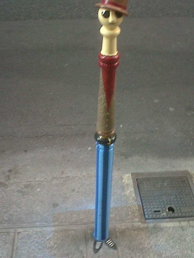 Nous évoquions dans deux articles ( 23 mai et 13 juin), la courte vie de deux potelets magnifiquement "humanisés" devant le magasin de chaussures homme dénommée  "L'échoppe de Black Dandy" situé au 23 rue des Blancs Manteaux (IVe). Tous deux avaient été gommés par le pinceau de l'employé municipal chargé de repeindre en marron tous les potelets de la rue sans distinction.