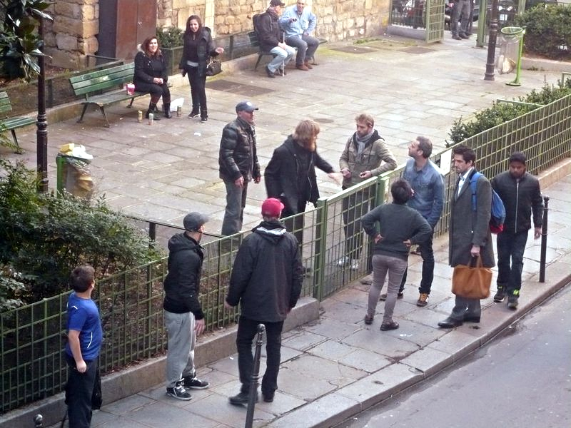 Haudriettes altercation 06 03 14Devant "l'Echelle du Temple" (*) alias place Renée Vivien (IIIe) le 6 mars, un énergumène et des riverains s'affrontent
