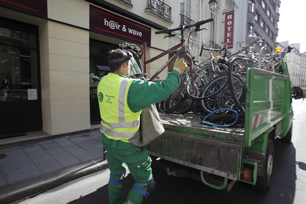 Enlèvement d'épaves de bicyclettes par la Mairie de Paris