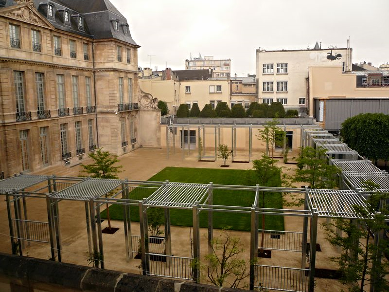 Vue du jardin le 28 mai 2013. Au fond, une construction nouvelle sans charme vient lêcher le corps de l'hôtel Aubert de Fontenay, dit hôtel Salé, du XVIIème siècle. Tout autour du jardin, la pergola litigieuse. (Photo VlM – cliquez pour agrandir)