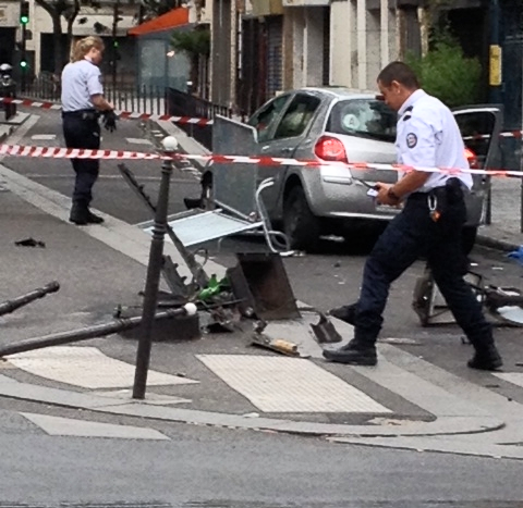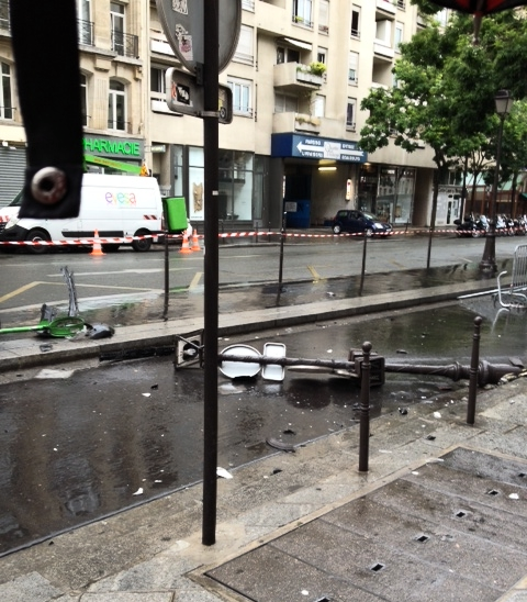Réverbère, poteaux de signalisation, poubelle, potelets, barrières à terre après l'accident (photo VlM !)