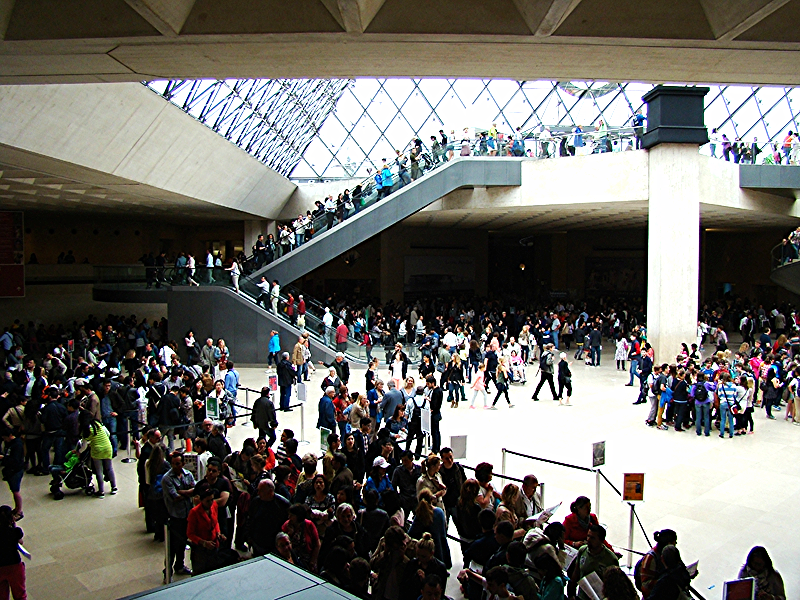 La foule des visiteurs à l'intérieur du Louvre sous la pyramide