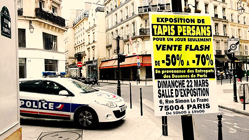 En dépit de la désapprobation des riverains qui en ont visiblement éliminé une partie, la campagne sauvage en faveur des "tapis persans" et de la salle d'exposition du 6 rue Simon Lefranc est restée bien présente rue des Archives, Rambuteau, Beaubourg, rue du Temple etc … Peu importe à ces marchands sans gène qu'on soit ici au cœur du Paris historique, dans un secteur sauvegardé…. et que la pratique soit interdite, voire dangereuse car ces panneaux de grande taille gênent la visibilité des passants lorsqu'ils traversent la rue.