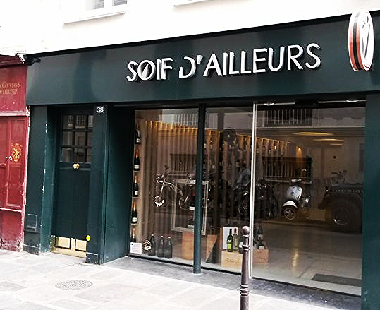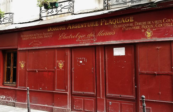 A gauche l'atelier de dorure-argenture-placage "l'électrolyse du Marais" au 40, et à droite le marchand de vins "Soif d'Ailleurs" au 36. (Photos VlM)