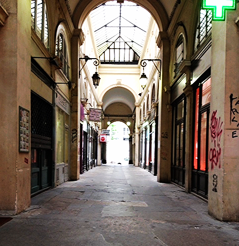 Inscription, côté place de la République, indiquant l’emplacement du début du passage détruit en 1869