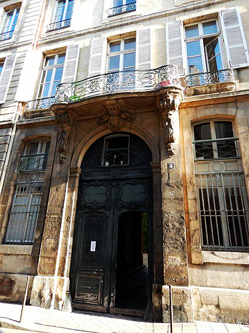 Dans la cour, des arcades sont elles aussi surmontées de mascarons figurant des divinités antiques. D'autres figures sculptées sont visibles au N°4, sur le voûte du porche et les côtés, représentant des animaux de différents continents. Un escalier assez majestueux avec sa ferronnerie se trouve dans le vestibule de style rocaille.