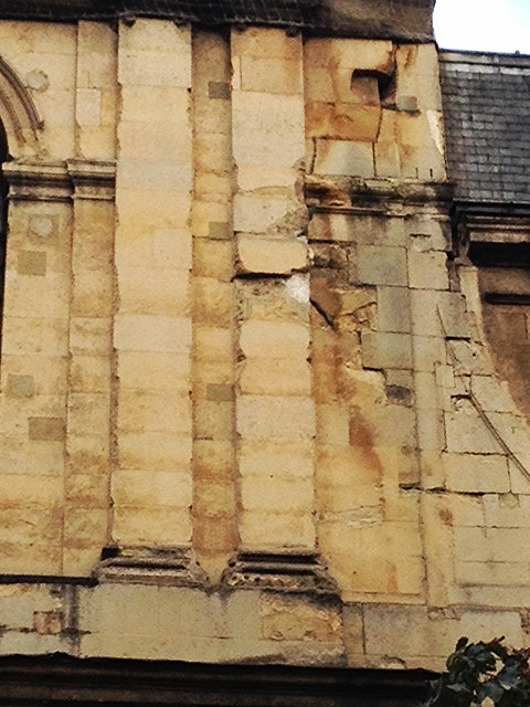 Détail des importants désordres de la façade de l'église des Billettes (IVe) (Photo VlM)
