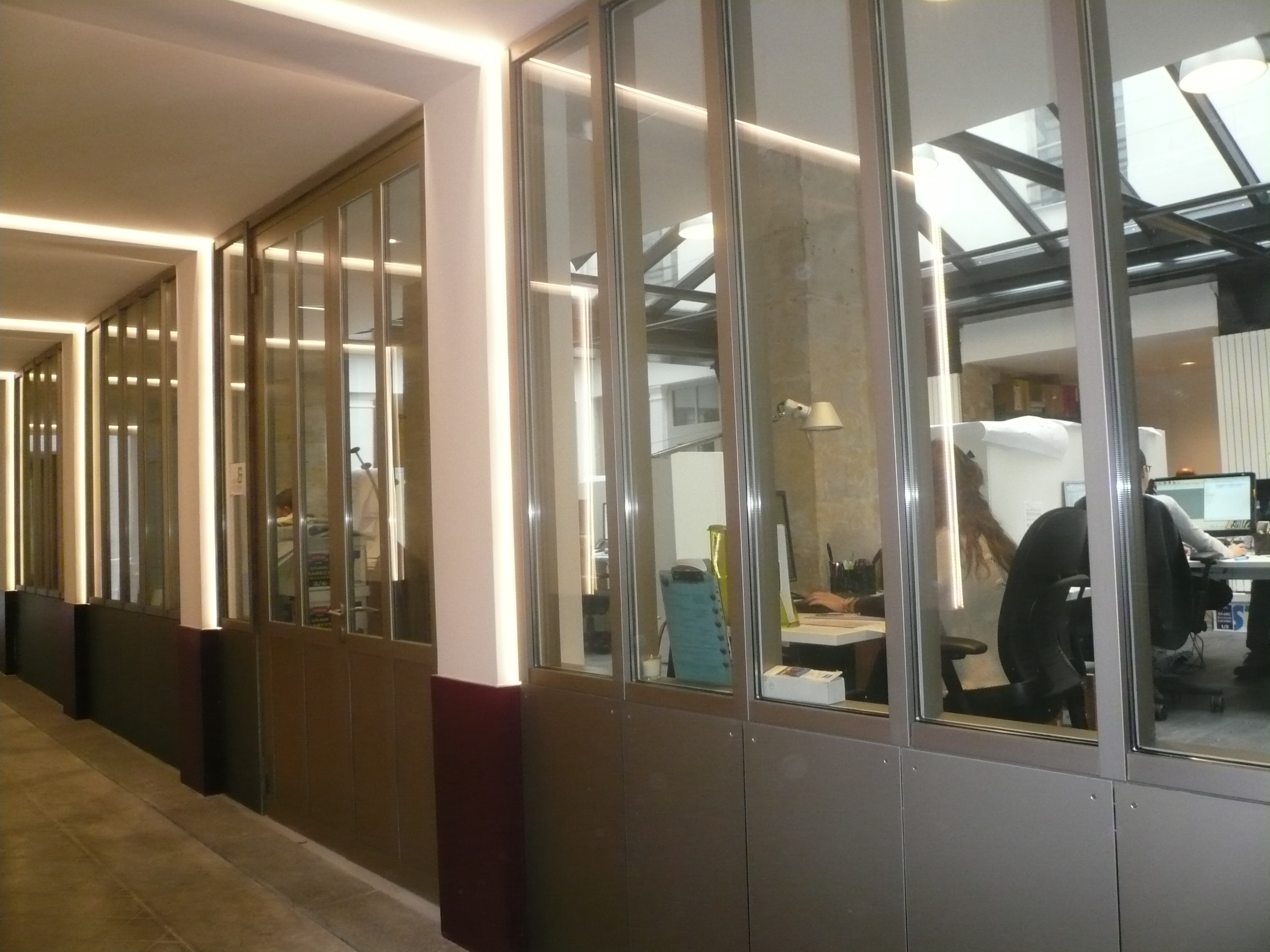 La cour elle aussi est restée dans son jus et c'est bien heureux. L'herbe qui pousse entre ses pavés séculaires lui donne un petit air de campagne. C'est une tâche verte entourée d'immeubles dont le style XVIIIème a été conservé à l'exception d'un des côtés dont l'architecture est résolument contemporaine, avec des pans métalliques et des volets immenses qui se plient en accordéon (voir détails – Atelier du Pont – maitre d’œuvre).