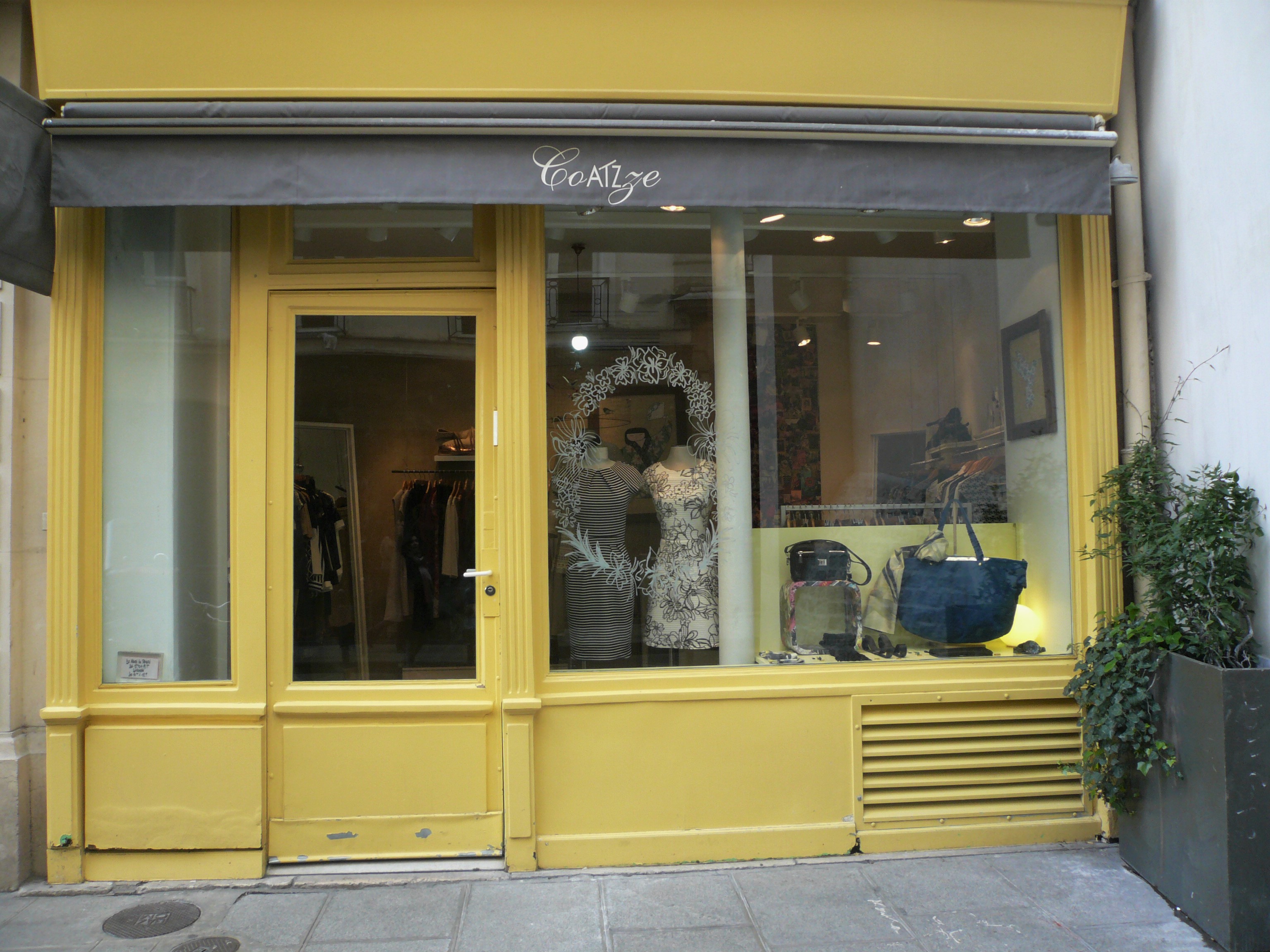 Devantures. A gauche, n° 21, magasin de prêt à  porter "Coatze" : un classicisme qui convient bien au Marais. A droite opticien "Parici" : un contraste de couleurs agréable mais la grande baie vitrée interpelle, aux côtés  de l'architecture bavarde de la porte.