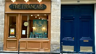 Harmonie des formes et des couleurs entre cette porte laquée bleue et la devanture du petit commerce de "thé français", annexe de Mariage Frères.