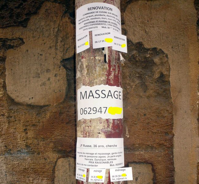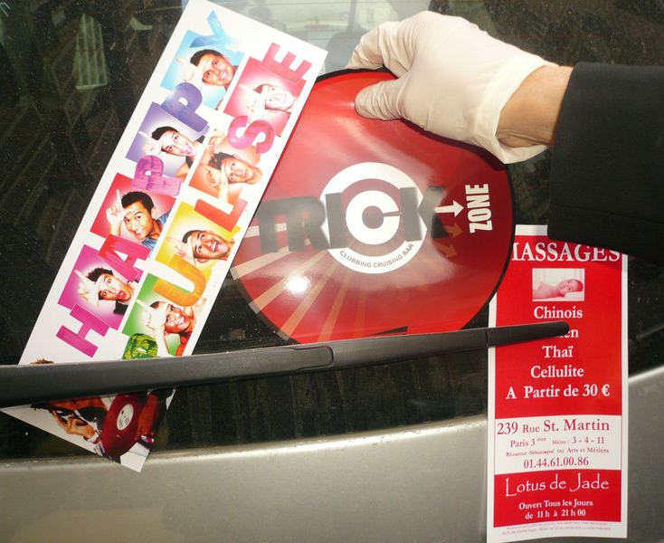 Affichettes à gauche (des arnaques à 99%) et flyers sur voitures (ou sur rebords de fenêtres) à droite