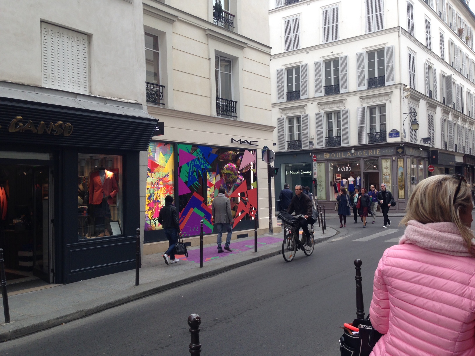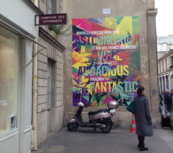Petite précision, l'annonceur, le magasin MAC a fait écrire au bas de ces collages invasifs la mention spéciale "Cette installation est éphémère merci de ne pas la dégrader le temps de l'exposition"… Nous disons nous "ceux qui la neutralisent sont les bienvenus ainsi que tous ceux qui boycottent la marque et le magasin pour ses atteintes au cadre de vie du Marais ".