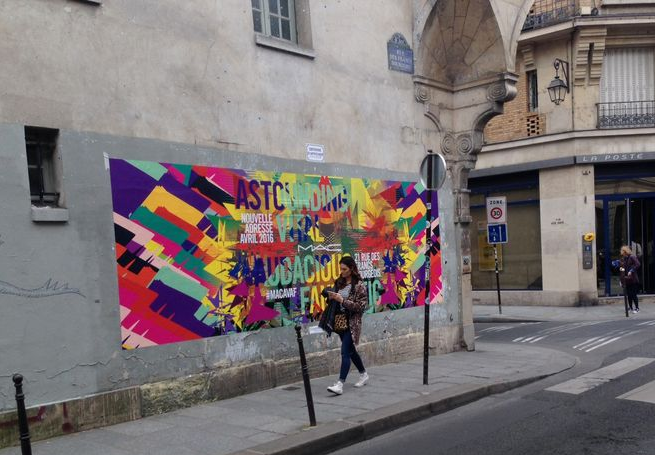 Des affiches sauvages énormes, bariolées, criardes, collées sur les vitrines de la boutique et tous les supports qui se présentaient dans le voisinage au mépris de la règlementation en vigueur. Non seulement les murs déjà mal en point (Hôtel Lamoignon, École de commerce ISEG…) défigurés par ces collages pitoyables mais les initiateurs de cette promotion de mauvais goût qui brave les interdits se sont permis d’essaimer aussi sur le trottoir et le comble, sur une grande partie du mur de la Bibliothèque Historique de la Ville de Paris, juste en face de l'entrée du musée Carnavalet.