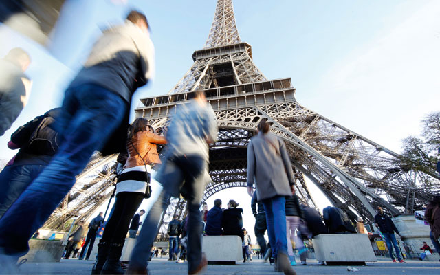 Touristes au pied de la Tour Eiffel (photo Journal du Textile )
