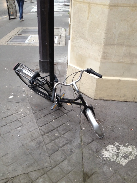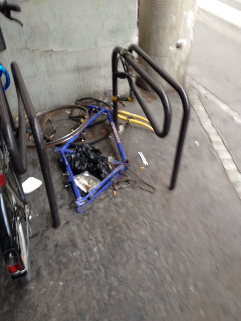 Bicyclette abandonnée et dépecée dans un râtelier près du gymnase de la rue Michel le Comte (IIIe) (photo VlM)