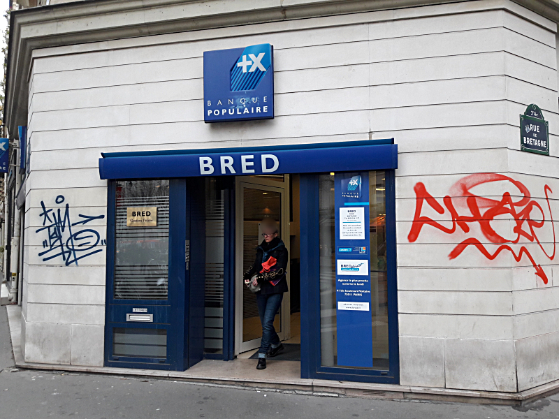 Tags hideux sur la devanture (pas très belle) de la BRED, 40 rue de Bretagne (IIIe)