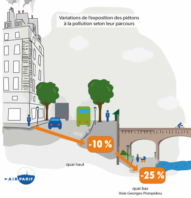 La Mairie de Paris publie aujourd'hui cette infographie d'Airparif qui affirme que la pollution a baissé de 25 % sur les berges de la Seine, ce qui n'a rien d'étonnant puisqu'il n'y a plus de voiture mais méritait d'être mesuré car on aurait pu penser que la pollution se répand sur la ville de façon assez homogène. Plus étonnant, la pollution aurait baissé de 10 % sur les quais hauts.