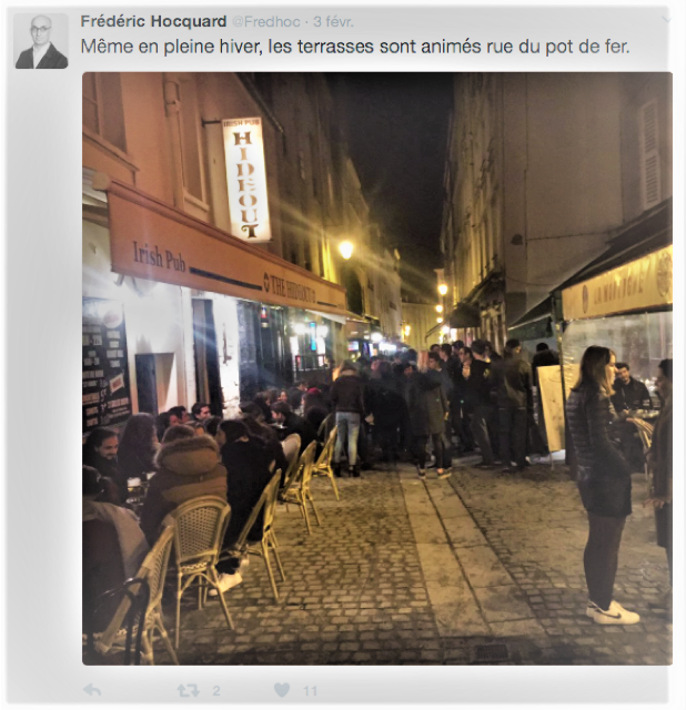 Rue du Pot de Fer dans le Ve (extrait d'un tweet de F. Hocquard : même en pleine hiver, les terrasses sont animés rue du Pot de Fer !)