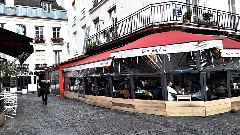 Sur cette place discrète qui est un mouchoir de poche, on compte près d'une dizaine de terrasses qui rivalisent de vulgarité pour offrir un maximum de places à leurs consommateurs en empiétant sur l'espace public avec des terrasses aux allures de bidonvilles. On voit sur la photo l'usage qui est fait des rideaux plastiques et des planches de récupération pour clôturer une emprise qui se soucie peu des dimensions définies par la Mairie de Paris.
