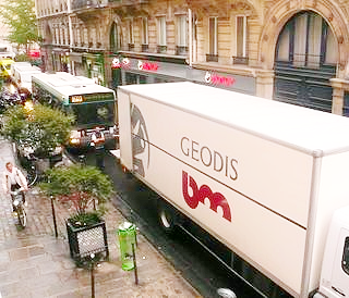Livraison du Monop' bloquant la circulation de la rue des Haudriettes (IIIe) (photo VlM)