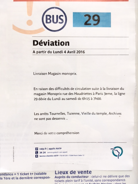 Solution choquante que celle mise en œuvre par la RATP sur la ligne 29… Constatant qu'un magasin Monop' (groupe Casino) situé rue des Haudriettes (IIIe) est livré chaque matin par des camions qui bloquent la rue (voir notre article du 4 octobre 2010), en dépit de nombreux espaces livraisons, et plutôt que de verbaliser, la régie a tout bonnement choisi la solution de détourner le trajet depuis le 4 avril dernier !!!