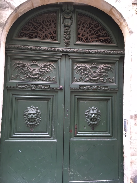 Sous l’imposte, les 2 grilles sont séparées par une guirlande de fleurs surmontée d'une coquille, sont représentés deux trophées figurant une couronne et des feuilles de palmier. Au centre deux magnifiques lions sculptés tiennent dans leur gueule l’anneau du heurtoir. Le lion est souvent utilisé sur les marteaux de porte. Ici sa physionomie a pris une allure presque humaine, regard farouche et chevelure folle, les deux têtes sont particulièrement expressives.