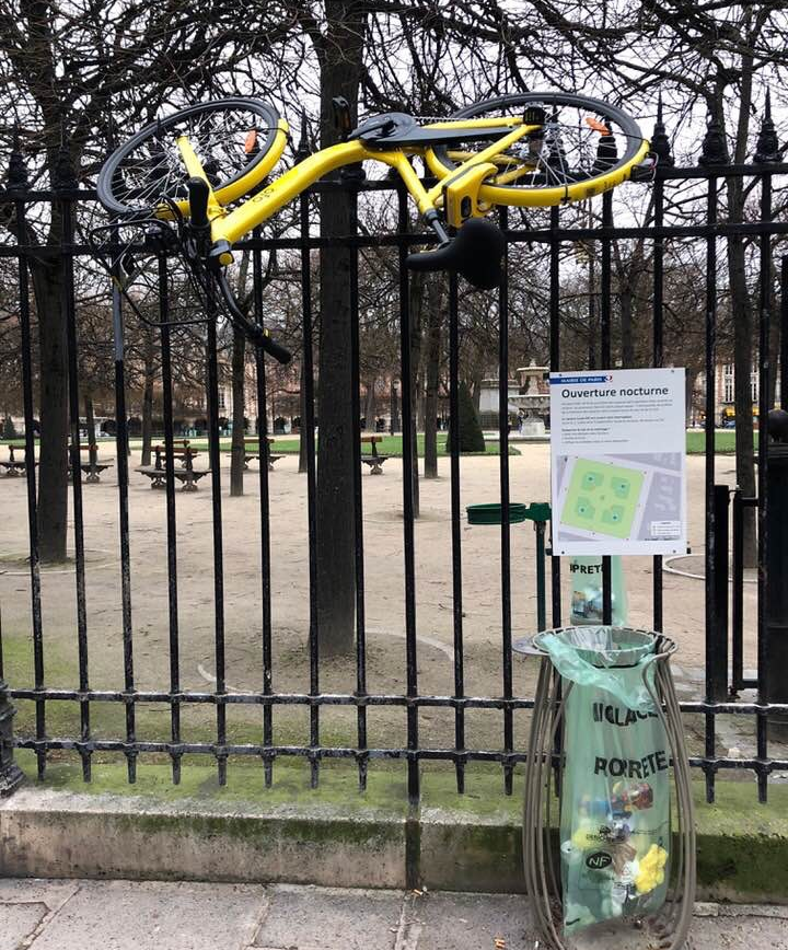 Un peu plus bas place des Vosges (IVe) c'est un genre de Vélib' empalé sur les grilles qui symbolise le fiasco d'une politique qui a bien commencé pour soutenir la "petite reine" mais qui après quelques tribulations est en train de virer au chaos.