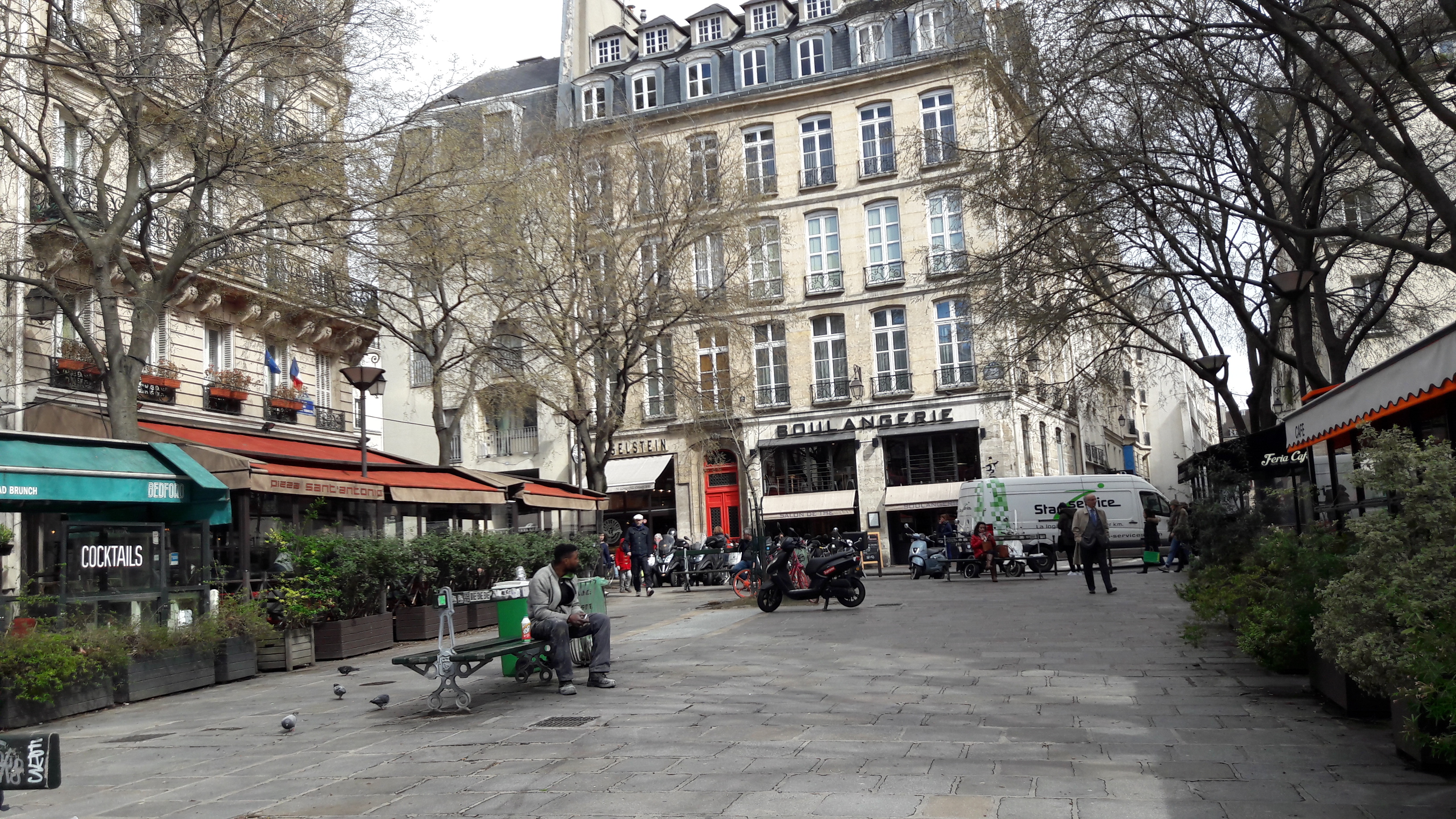 Cette photo montre le banc d'entrée, côté Rivoli. Il y avait ce jour-là un homme en hardes qui y séjournait dans la bonne humeur en cassant la croute. Quelque aliment est tombé au sol. Il s'est mis devant nous en demeure de nettoyer la dalle. Nous n'avons pas hésité à filmer et publier cette scène car elle possède à nos yeux un certain pouvoir de réconciliation des uns à l'égard des autres.