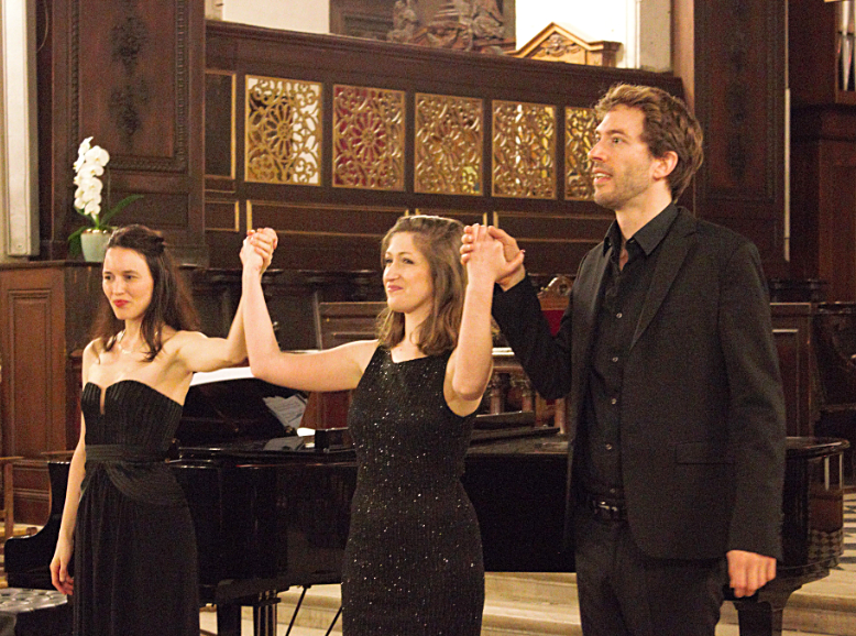 C'est la fin de leur prestation. Magali Albertini la pianiste, à gauche, Pauline Feracci la soprano à droite et Thibault De Damas baryton au centre saluent un public encore sous le charme et qui leur dédie ces fleurs.