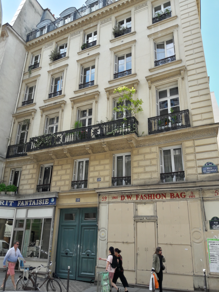 Bel immeuble de rapport de quatre étages plus attique mansardé, dont l'esthétique, comme c'est souvent le cas, souffre de l'indigence des boutiques au rez-de-chaussée. 59 rue du Temple (IVe) (Photos VlM)