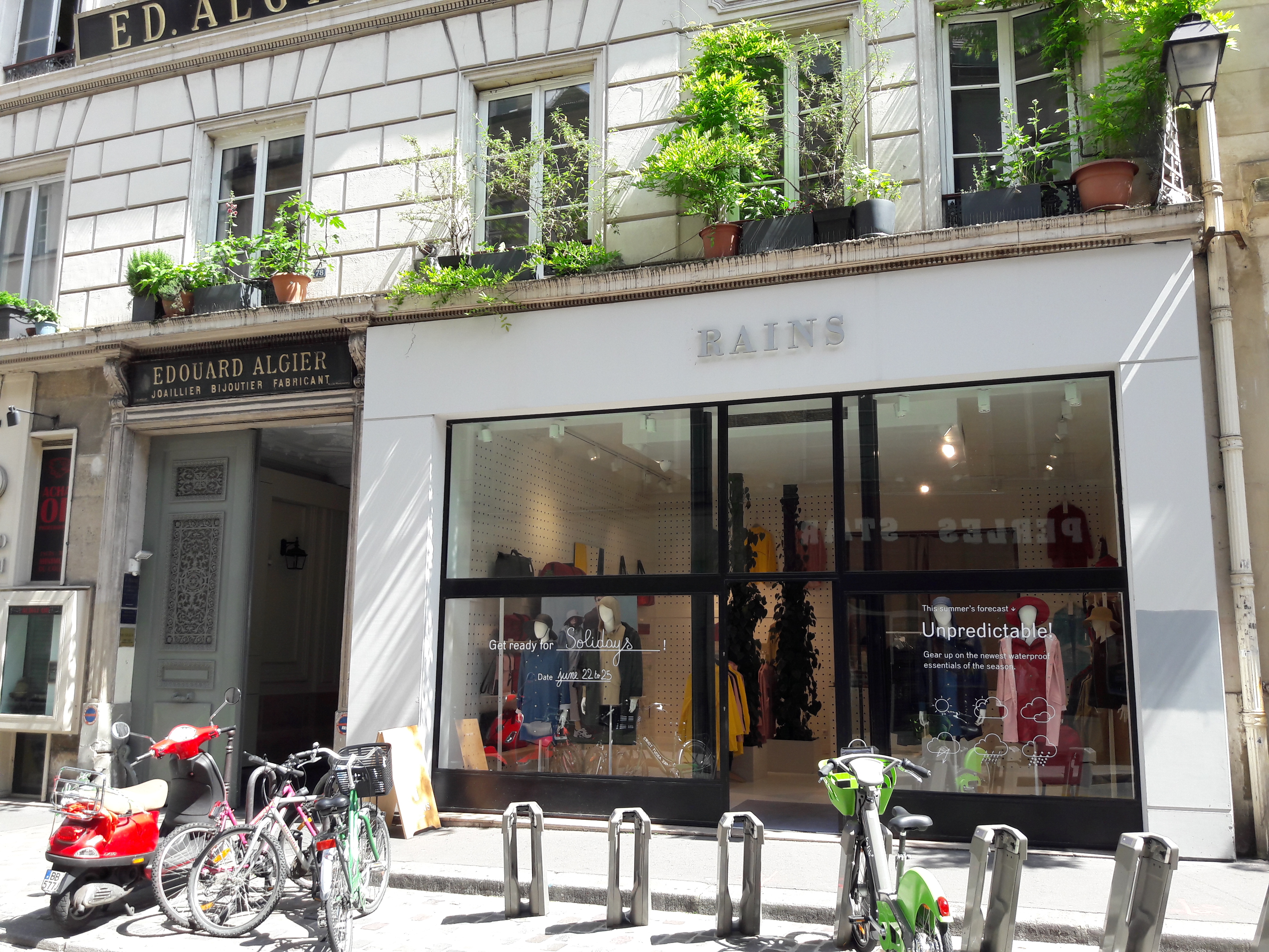 Il y a 18 mois, une de ses réalisations conduisait à l'ouverture de cette boutique 78 rue du Temple, à l'enseigne "RAINS", un vendeurs de vêtements pour la pluie.