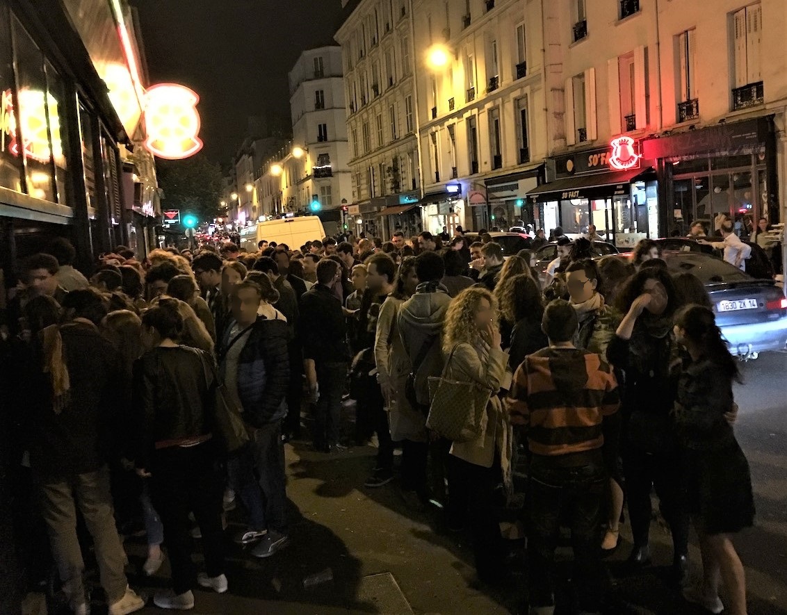 Minuit, foule devant les bars rue Oberkampf (XIe)