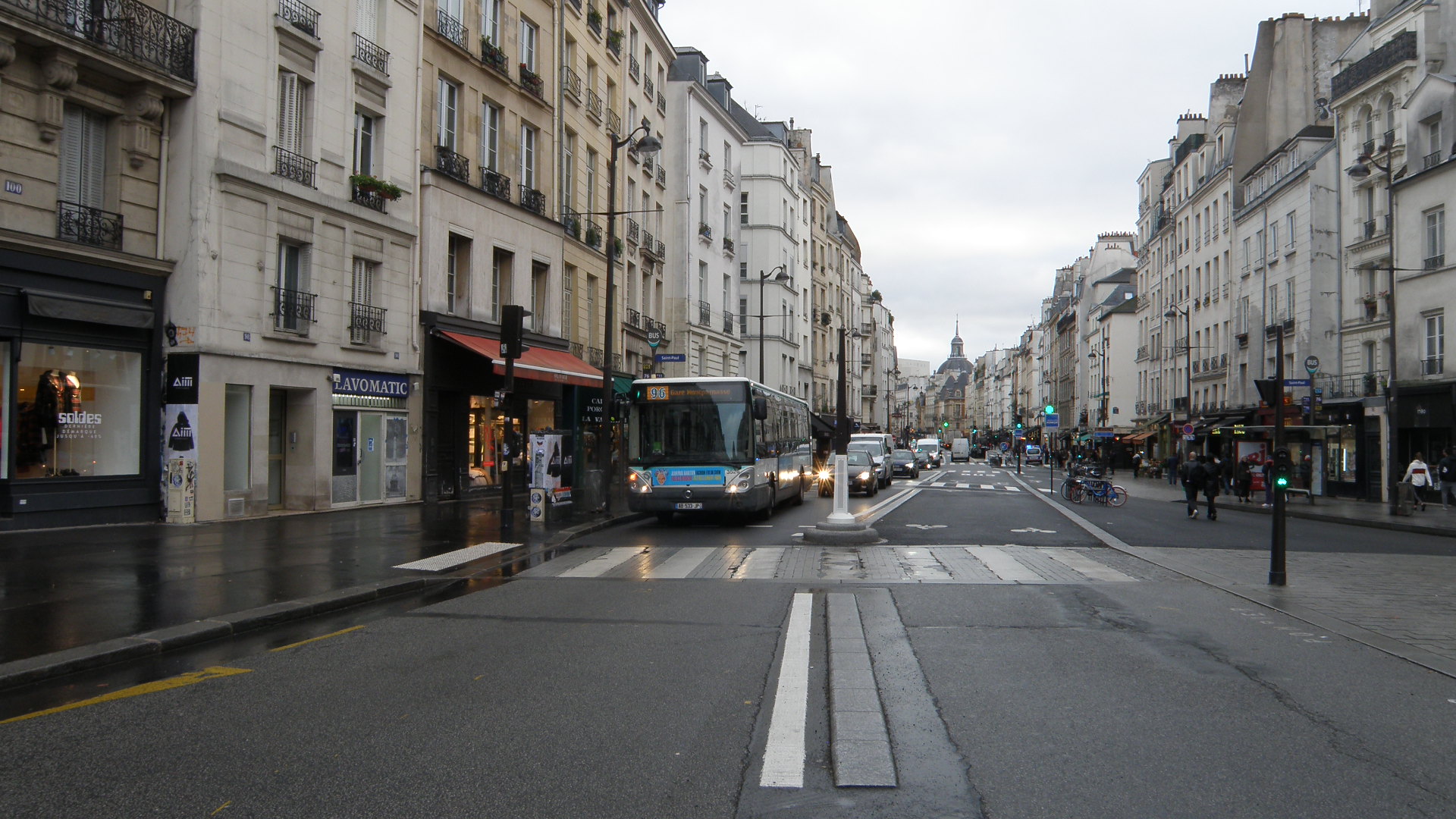 Rue Saint-Antoine, la situation est bien plus complexe. Il s’agit d’une artère très commerçante, avec un double sens de circulation automobile. Pour répondre à ces impératifs, la largeur de la chaussée a été divisée en trois : côté impair la double voie cyclable, au milieu de la chaussée une zone consacrée au stationnement des véhicules de livraison et des engins à deux roues, enfin côté pair le peu d’espace restant doit absorber le double flux automobile – ce qui a obligé à supprimer la voie réservée aux bus. De nombreux dysfonctionnements sont apparus immédiatement.