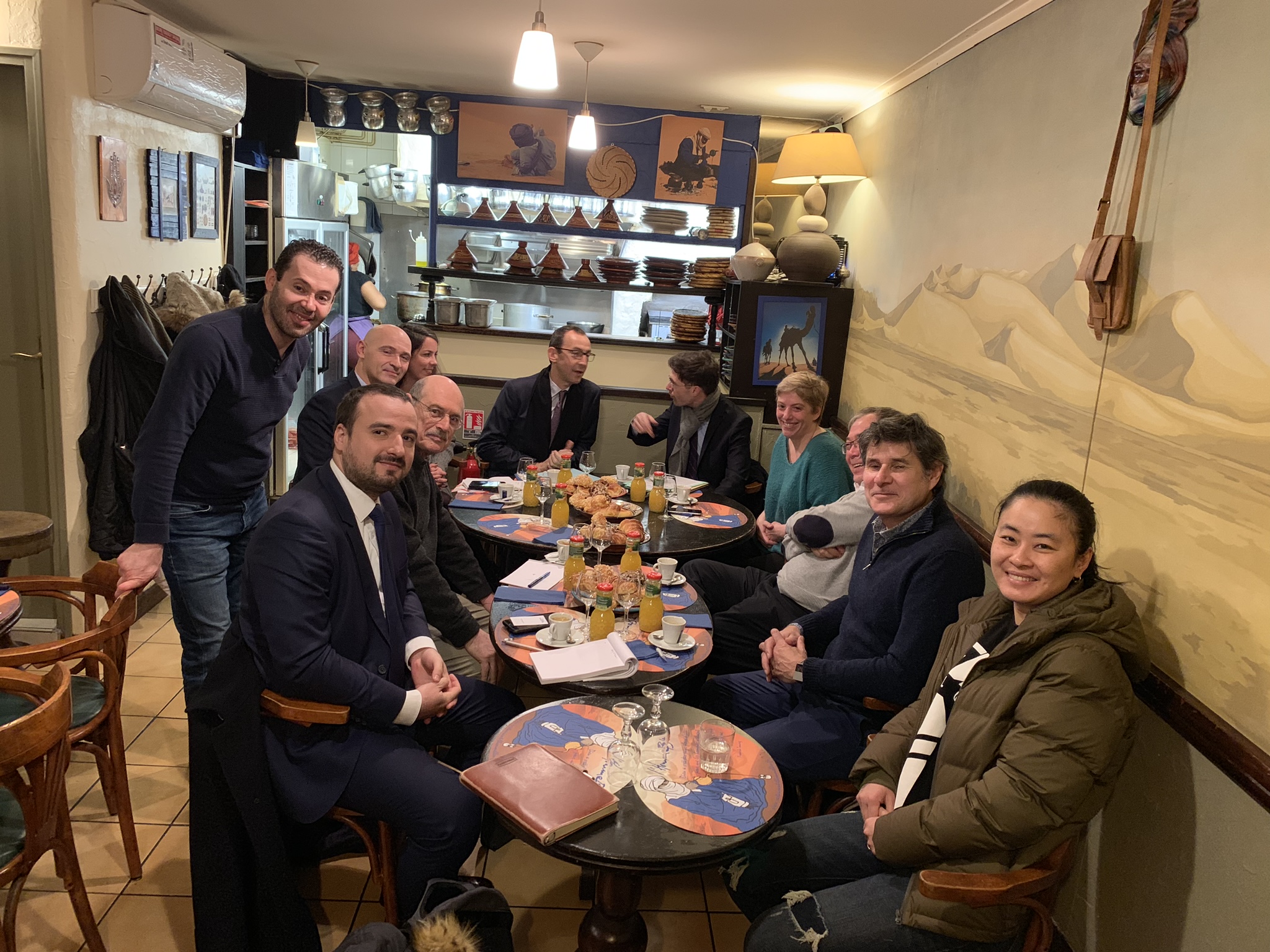 Il ne s'agit pas d'une fête mais d'une rencontre de travail. La photo réunit dans un établissement du XIe, "l'Homme Bleu", 55 rue Jean-Pierre Timbaud, le Directeur de cabinet adjoint du Préfet de police Matthieu Garrigue-Guyonnaud et son conseiller Luis Fernandez, le Maire du XIe François Vauglin, le Commissaire central de l'arrondissement Fabrice Corsaut, des représentants du collectif "Riverains du XIe" et une délégation de commerçants