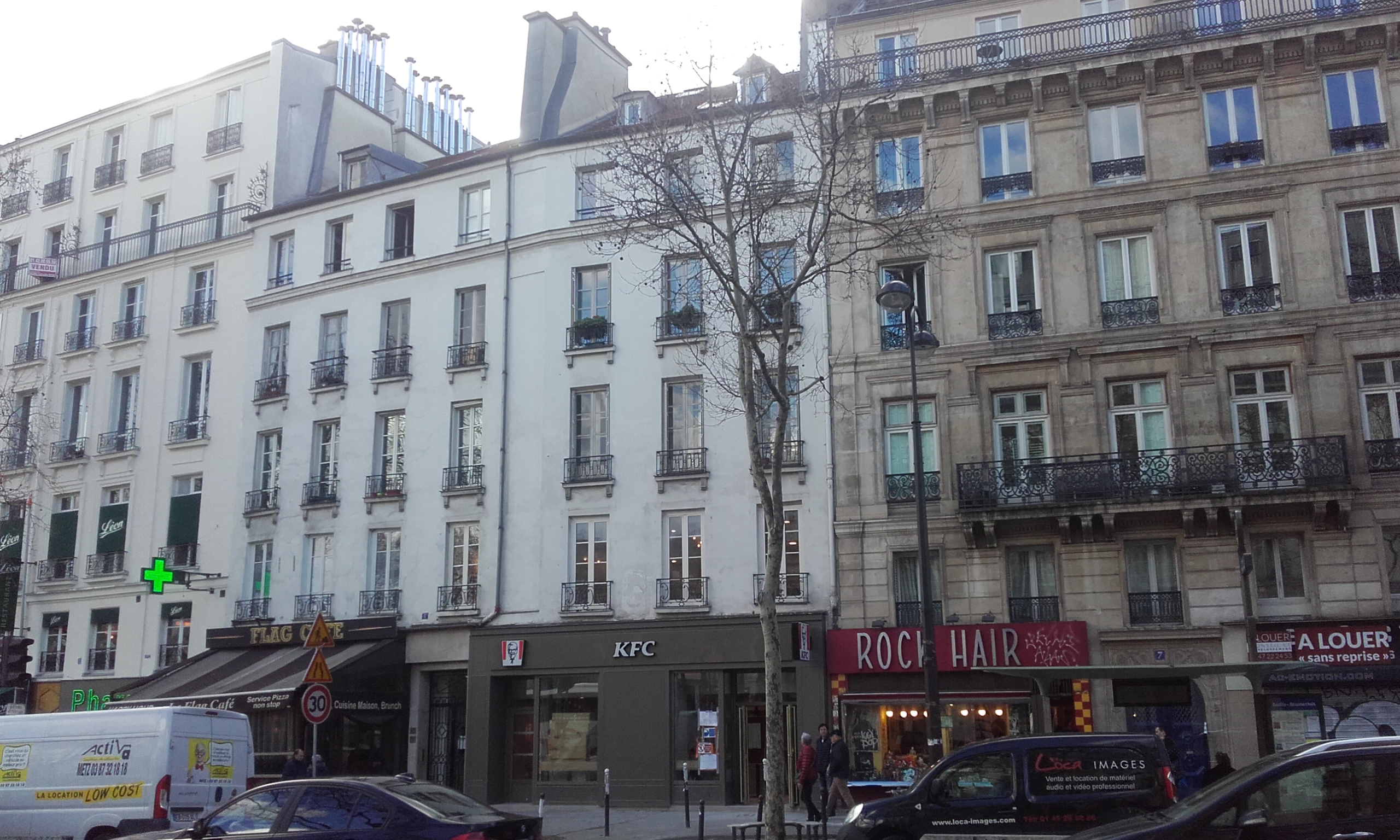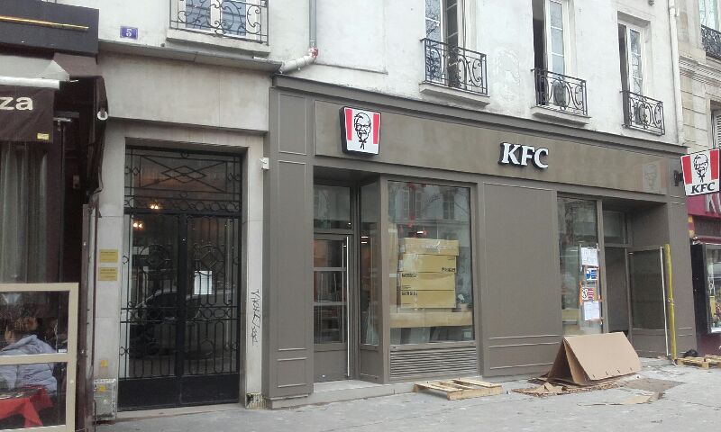KFC (Kentucky Fried Chicken ou poulet frit du Kentucky) en travaux 5 boulevard Beaumarchais (IVe). Ils ambitionnent d'occuper le rez-de-chaussée et le premier étage (Photos VlM/FB)