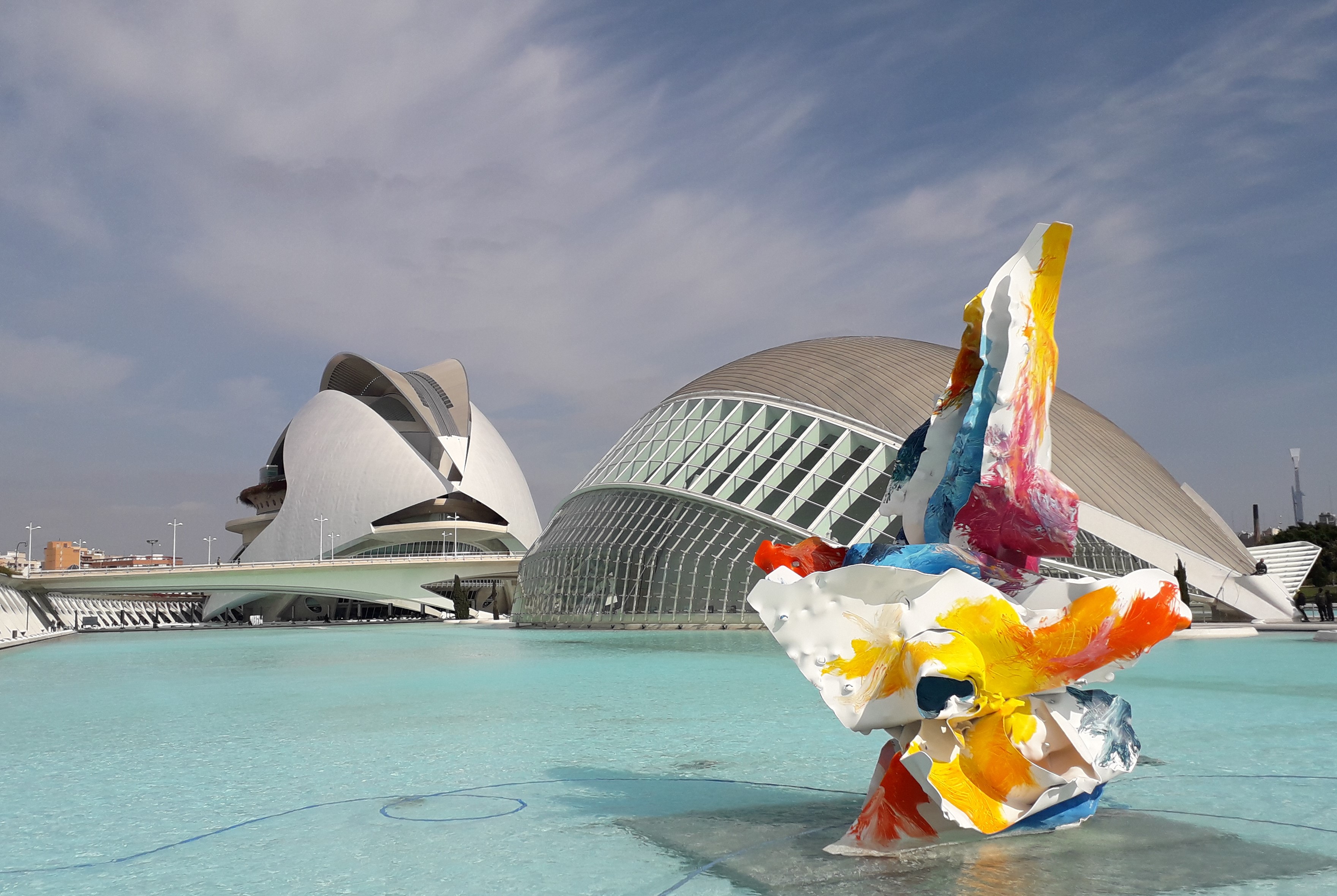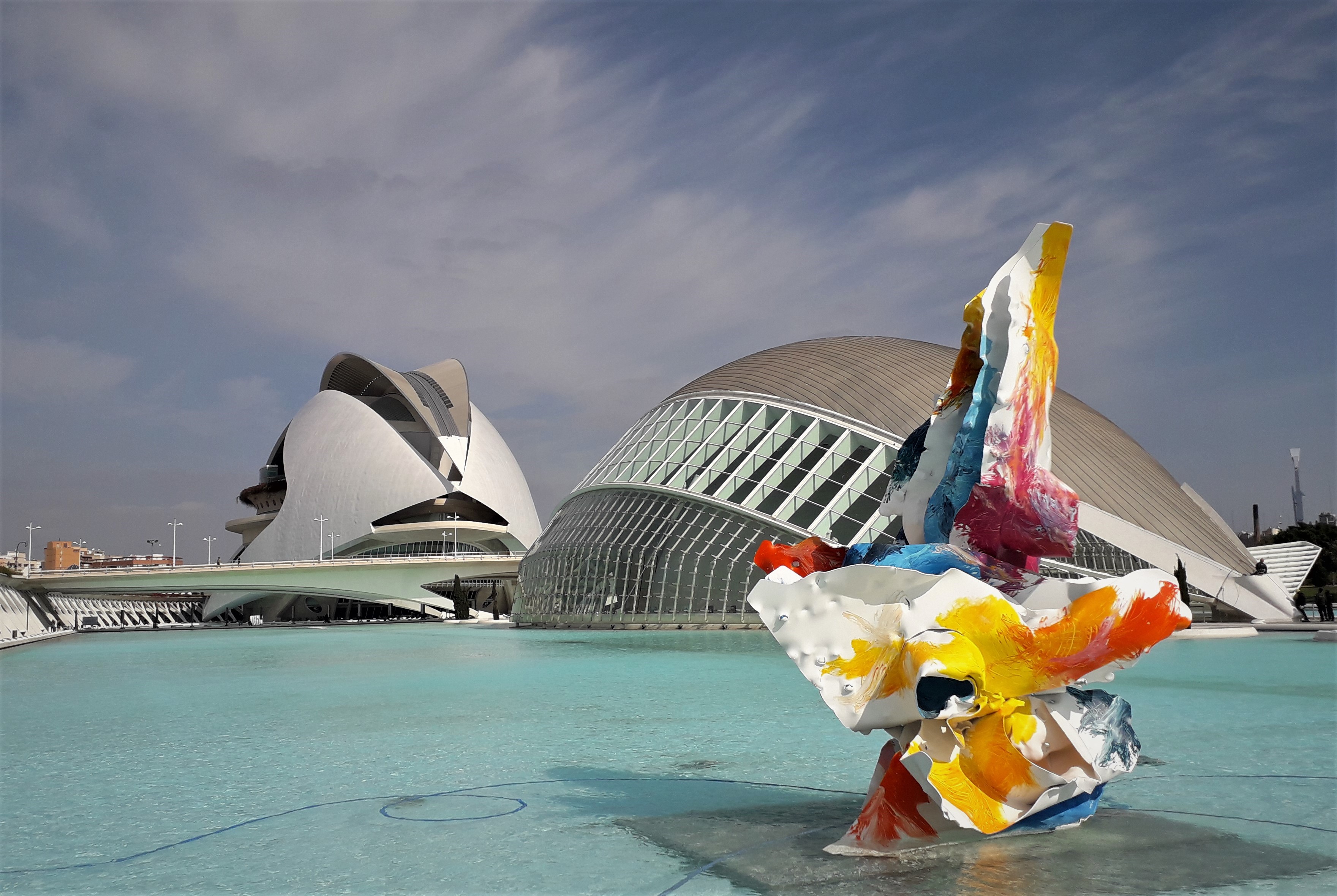Cité des Arts et des Sciences, "l'Hémisphéric" à droite, le Palais des Arts au fond. Au premier plan, une sculpture de feuilles d'aluminium peintes à l'acrylique, du plus heureux effet…. (Photos VlM)