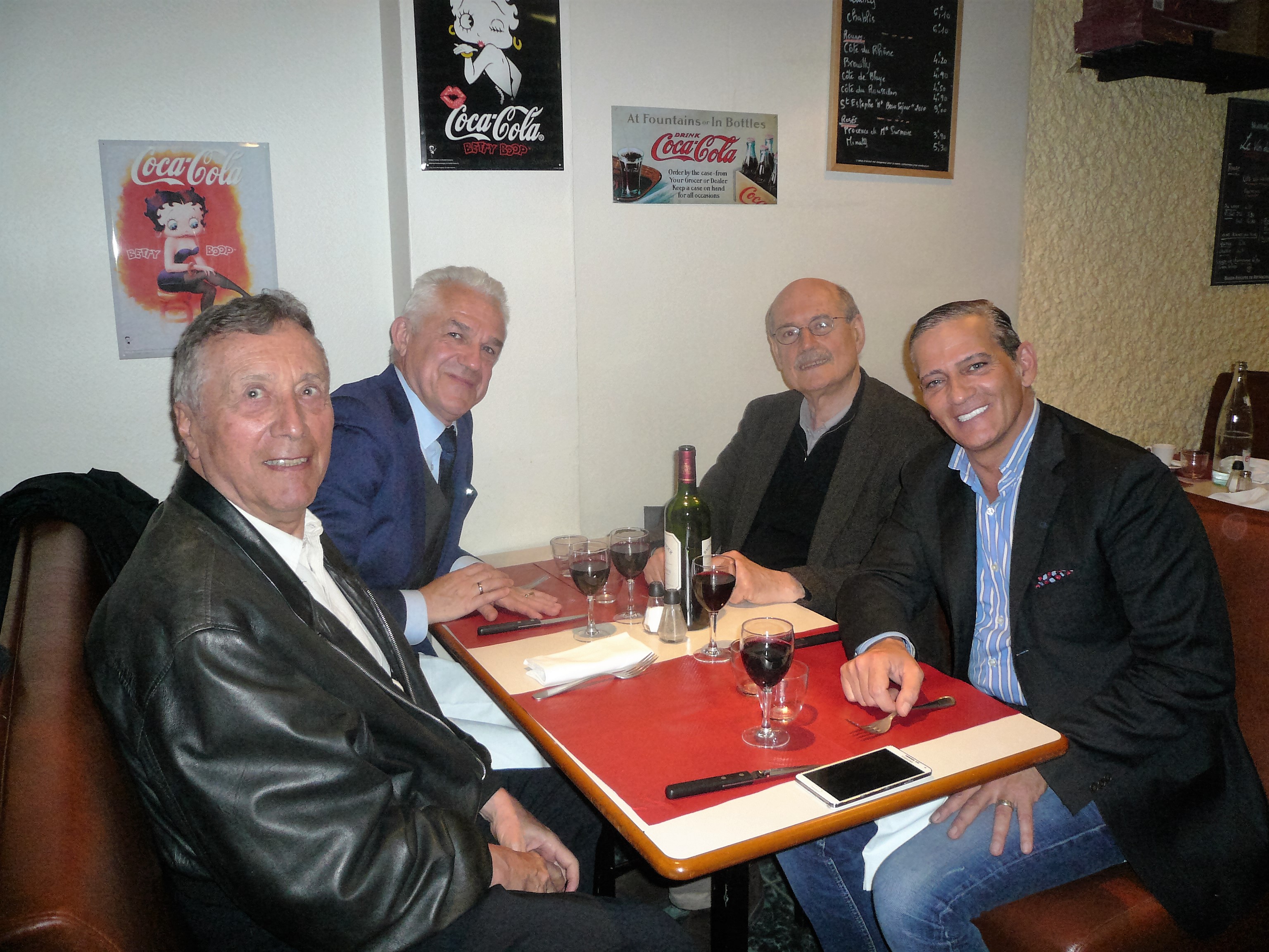 Echanges conviviaux en 2016 autour d'un verre de Bordeaux entre Gérard Siad, président du SNEG, Jean-François Revah et Gérard Simonet, présidents de "Riverains du XIe" et de "Vivre le Marais ! Paris-centre", en présence de Stéphane Martinet, adjoint au Maire du XIe