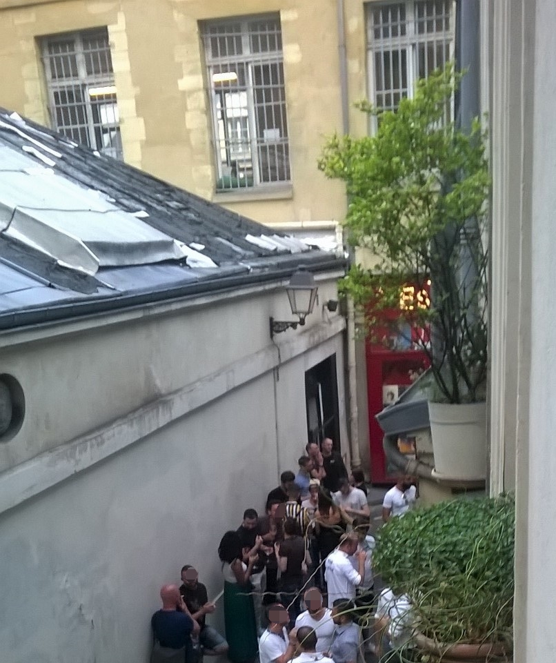 Le Who's, un bar-restaurant au 14 rue St Merri (IVe), avec une extension sous verrière mitoyenne de l'immeuble social Paris-Habitat du 16 rue St Merri. Il ouvre aussi sur le 3 rue Pierre au Lard avec bar et discothèque de fait, génératrice de tapage nocturne et d’occupation bruyante de l'espace public (Photo VlM/ résident du 12 rue St Merri, juin 2018)