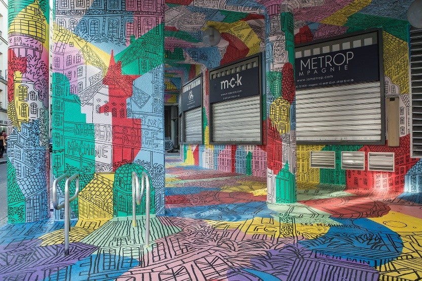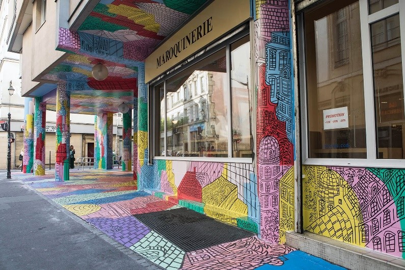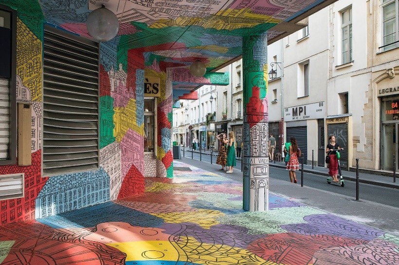 Sur les colonnes et murs des façades de l’immeuble, des dessins au trait noir suggérant des bâtiments, entremêlés, juxtaposés, dégagent l’impression du foisonnement de l’architecture urbaine, en partie rêvée, avec néanmoins quelque sites identifiables, Moulin Rouge, Arc de Triomphe, etc… Même travail de fresque au plafond et sur le sol de ce préau. L’ensemble dégage une impression de fraîcheur et de gaité, expression picturale à la frontière entre figuration et expression onirique, invitant le passant à la rêverie.