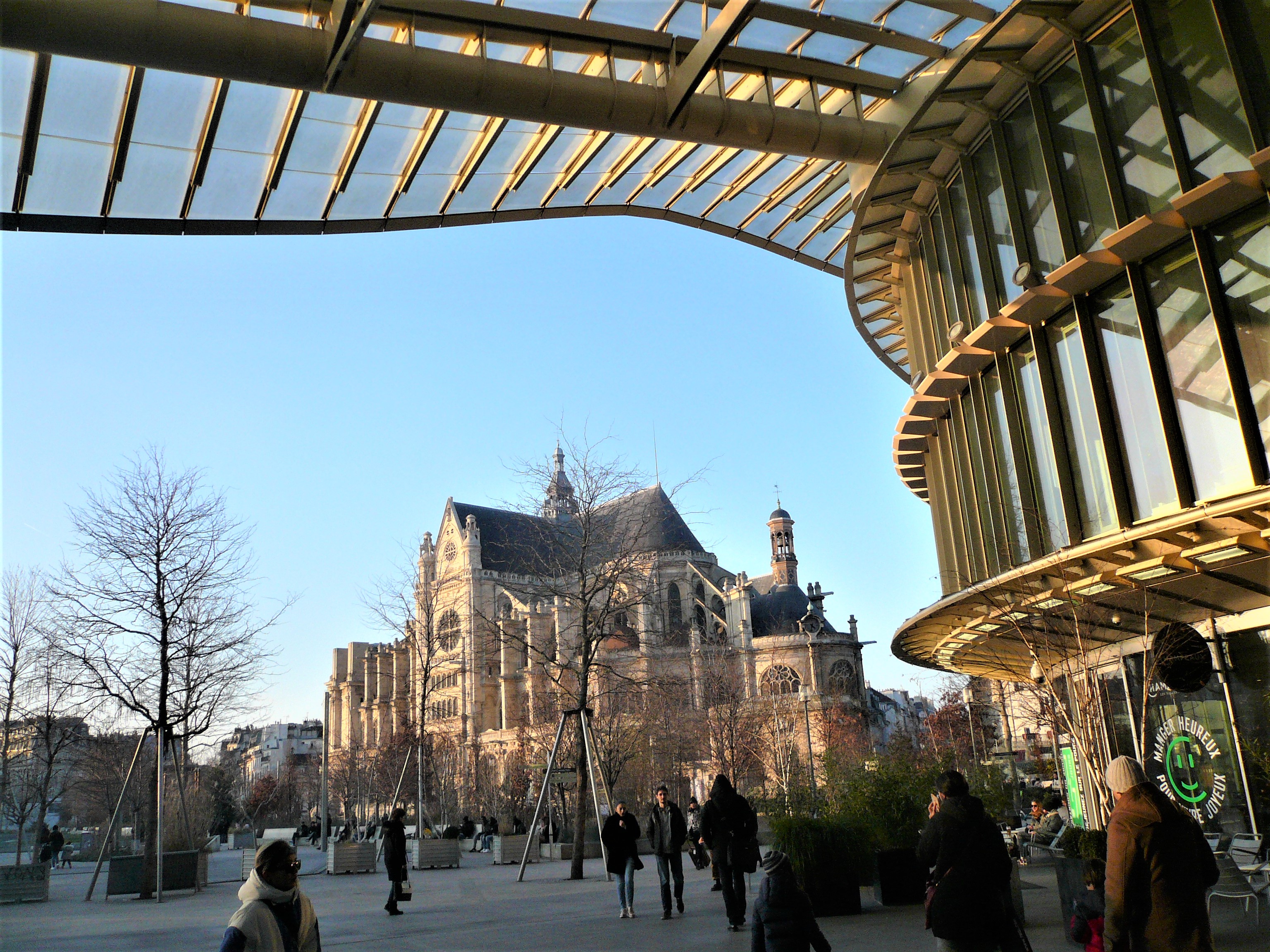 Perspective sur l'église Saint-Eustache depuis l'entrée du forum des halles. (Photo VlM, cliquer gauche pour obtenir une vue haute définition)