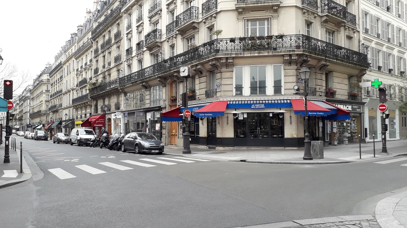 Très animé d'ordinaire, le carrefour Archives/Rambuteau (IIIe et IVe) est désert. Les habitants sont confinés chez eux, les établissements recevant du public sont fermés à l'exception des pharmacies et des commerces de bouche. De rares véhicules circulent, seules quelques voitures en stationnement résidentiel indiquent que la ville n'est pas tout à fait morte (Photo VlM – clic gauche dans la photo pour l'améliorer).