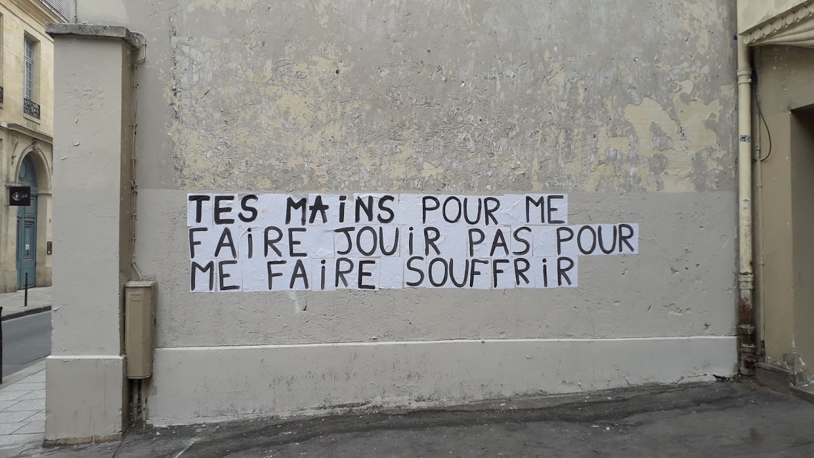 Ce n’est pas ce genre d’affiches que j’arrache, seulement celles du système publicitaire industriel, 2e budget mondial après l’armement et avant l’industrie pharmaceutique qui guéri les maux provoqués par les deux premiers. Je trouve les affiches féministes légitimes même si elles sont illégales, au risque de choquer parfois quelques pruderies qui pourraient être du déni, car la violence masculine envers les femmes est un fléau si bien ancré dans la société au point d’être banalisé dans les films, les chansons et la publicité, et de ne plus choquer personne, qu’il est dans ce brouhaha très difficile de lancer l’alerte, et je trouve cette communication nécessaire, même si cette lutte oublie de prendre en considération la souffrance des hommes qui les pousse à devenir agressifs, souffrance qui a pour origine des traumatismes enfantins, et parfois des mutilations sexuelles comme la circoncision, elle aussi banalisée.
