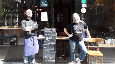 En attendant de reprendre officiellement le service, le Jackpot propose un menu unique "de transition", qui est en soi plein de promesses : une salade de poulpe/pommes de terre pour 6,50 € en entrée, un Dhal (lentilles corail, lait de coco, cardamone) en plat pour 8,50 € et un riz au lait chantilly, fleur d'oranger, chocolat, sablé pour 5,50 € comme dessert.