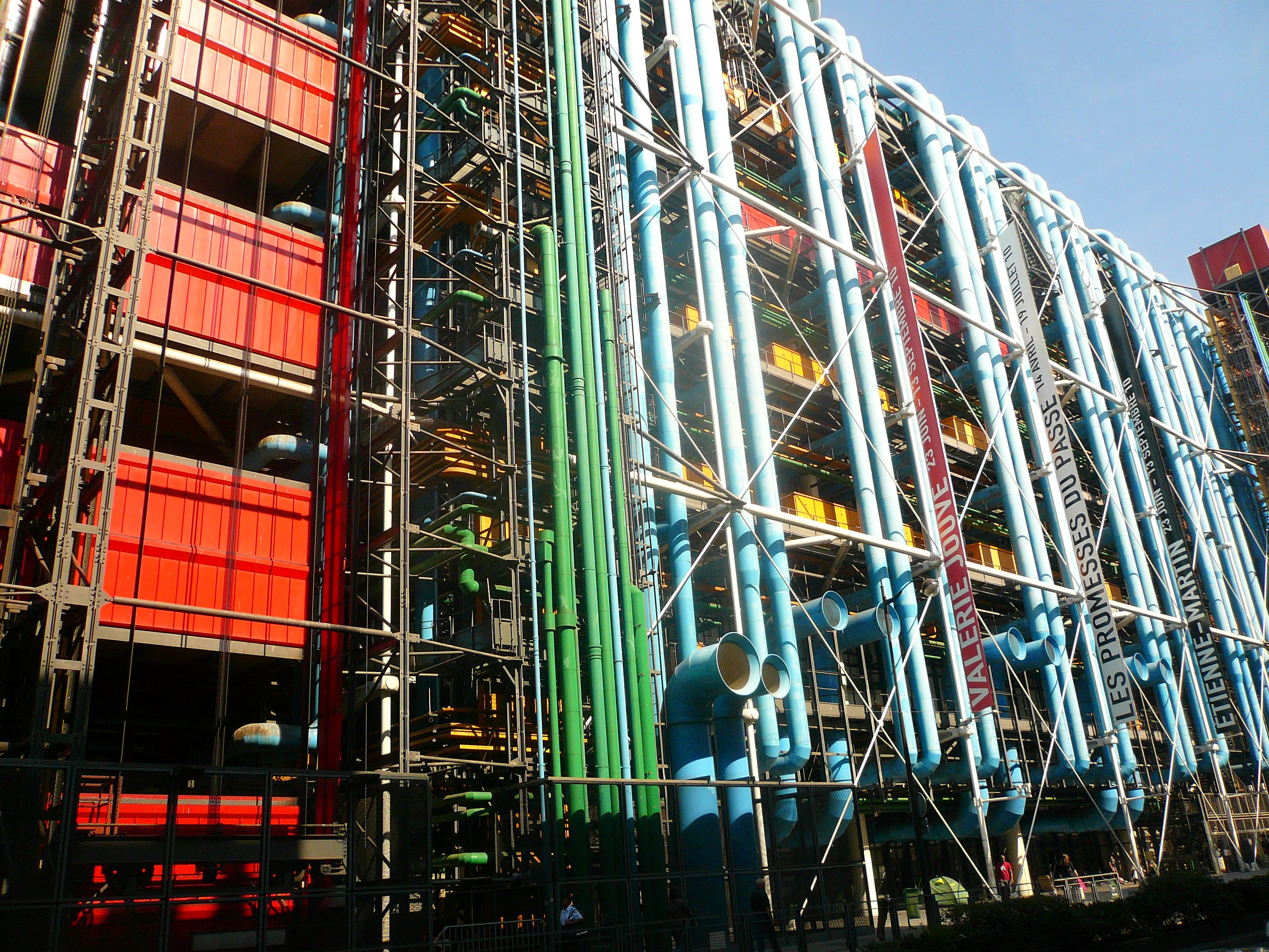 Inauguré en 1977, cet édifice qui interpelle a suscité une controverse en raison de sa conception et de son esthétique. L'agence d'architectes Renzo Piano, retenue par l'établissement public chargé de conduire le projet, fit le choix de reporter sur l'extérieur toutes les servitudes qui encombrent généralement les bâtiments qui accueillent du public : escaliers, ascenseurs, tuyauteries, passerelles…. et les éléments de la construction qui participent à la résistance de la structure.